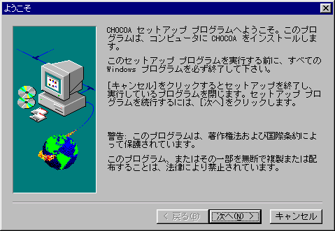 次は画面が青くなってセットアップ画面になります。次にでてくるウィンドウはこんなのです。 ちゃんと読んでおきましょう!とにかく、コピーして他人にあげたりしちゃダメですよってことですね(^^;;。 ちゃんと読んだら、次へをクリック!