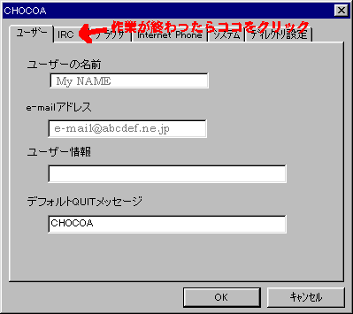さてするとインストールは完了するはずです!さっそくCHOCOAを起動してみま しょう! すると、下のようなウィンドウが出てきます。 ちゃんとユーザー名とE-Mailアドレスがあっていますか?確認しましょう